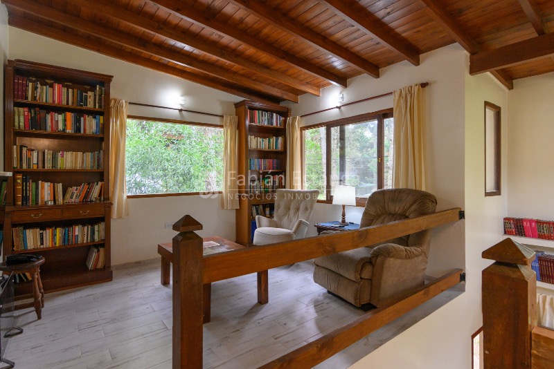Un ambiente abierto playroom/espacio de lectura con espacio de escritorio que balconea al living.
