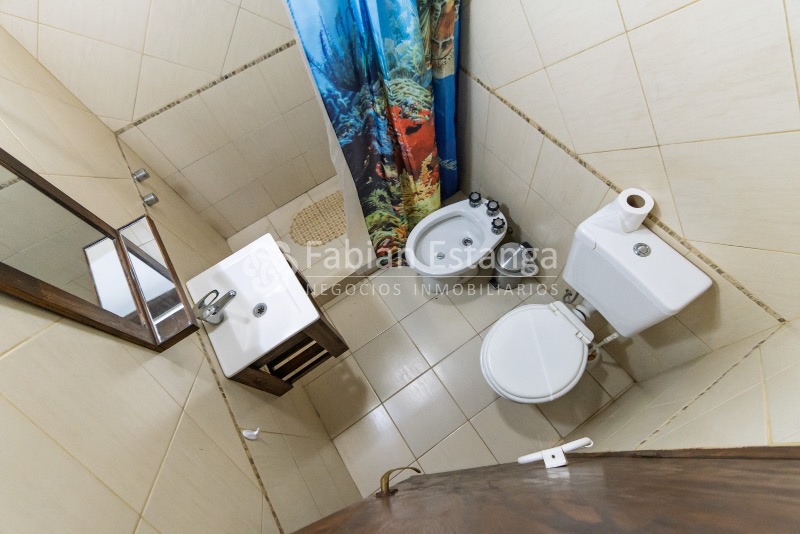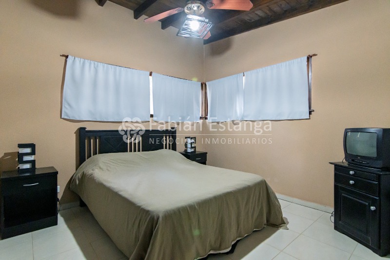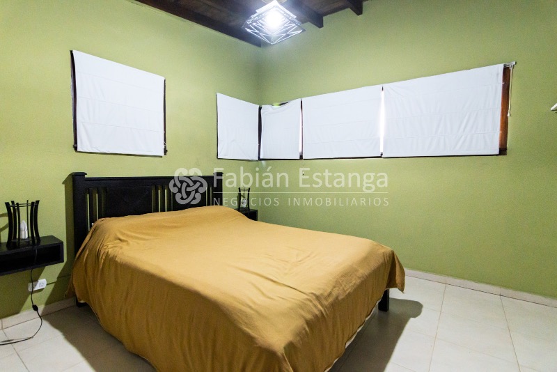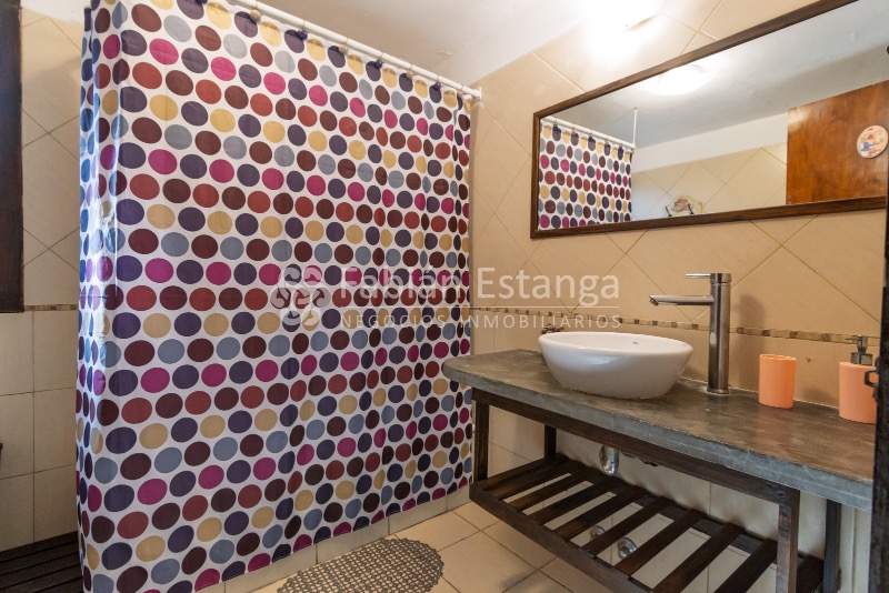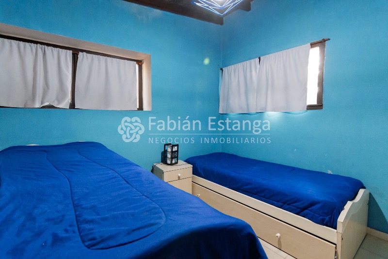 Dormitorio con una cama simple mas un carrito con baño en suite con ducha.