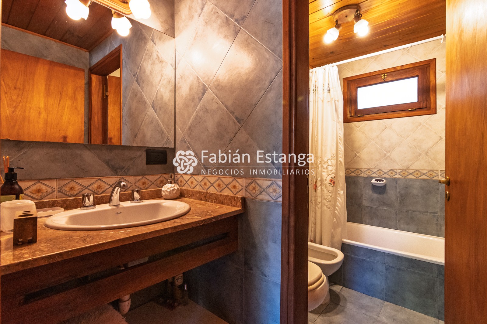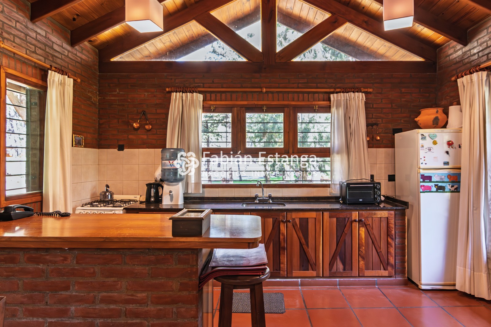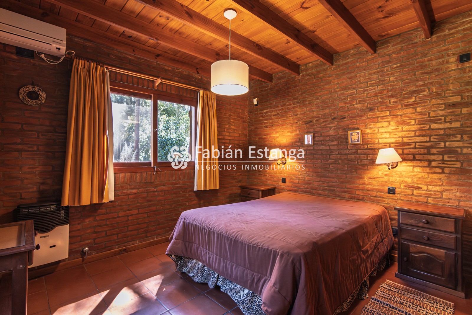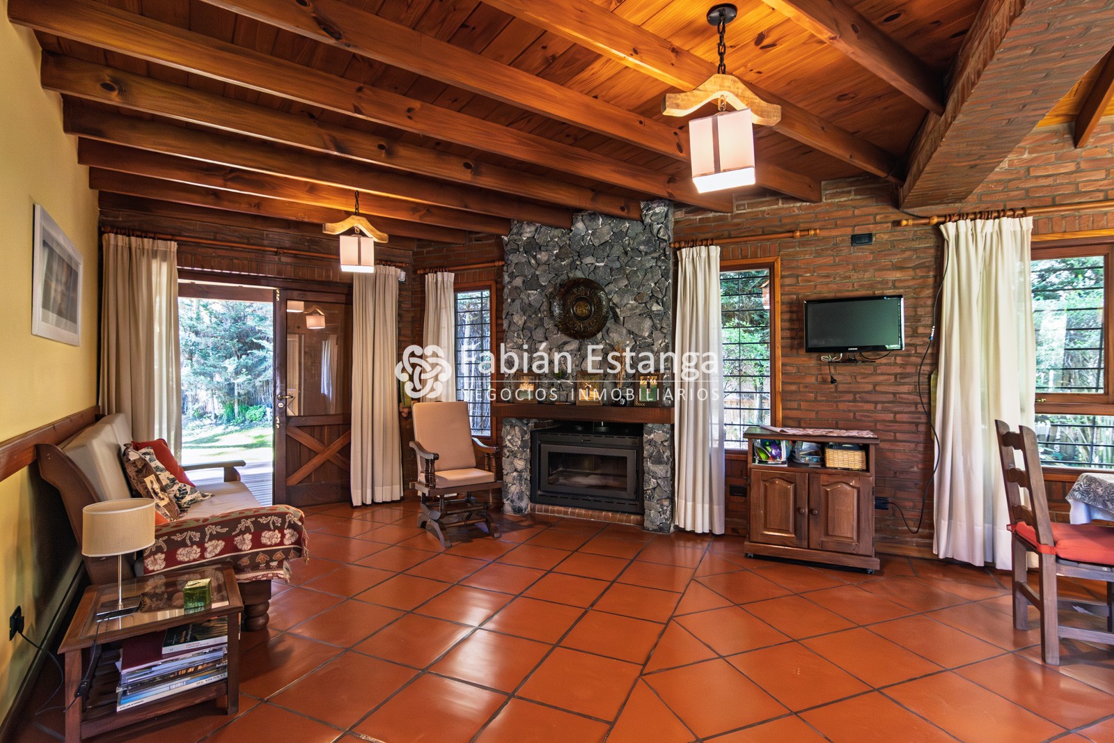 Amplio estar con hogar a leña Ñuke, aire acondicionado, calefactor tiro balanceado y salida a amplia galería semicubierta con parrilla.