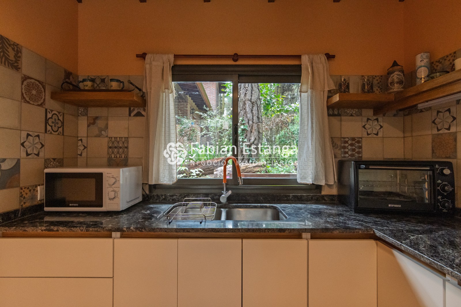 Cocina completa con microondas, heladera con freezer y extractor de aire.