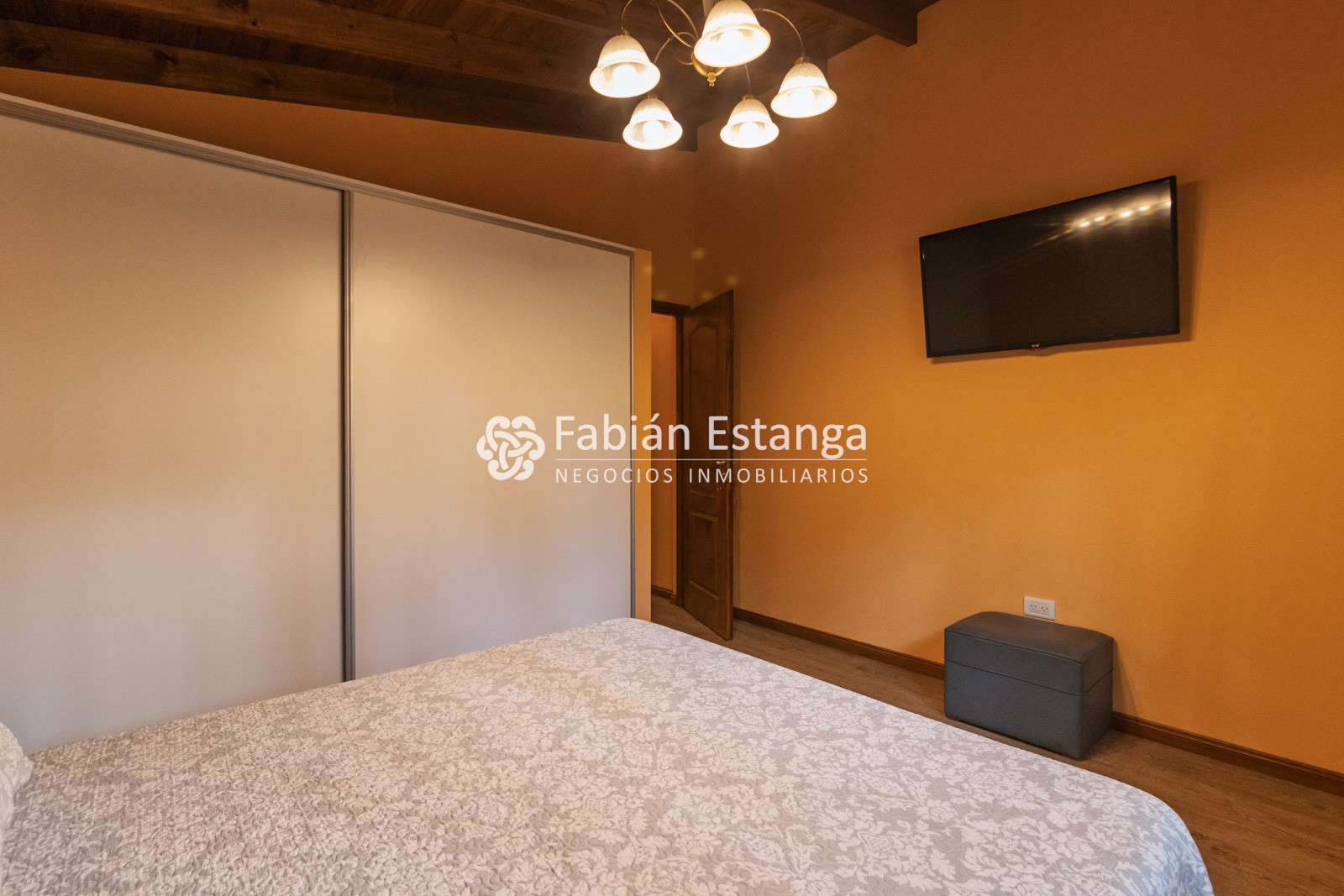 Dormitorio principal con cama matrimonial queen, placard, TV 43” con chromecast, aire acondicionado frío calor y baño en suite completo con ducha.