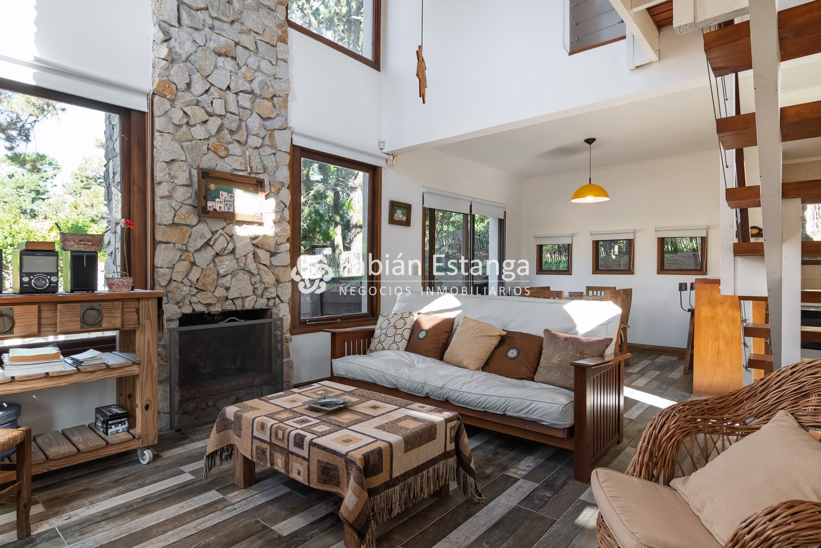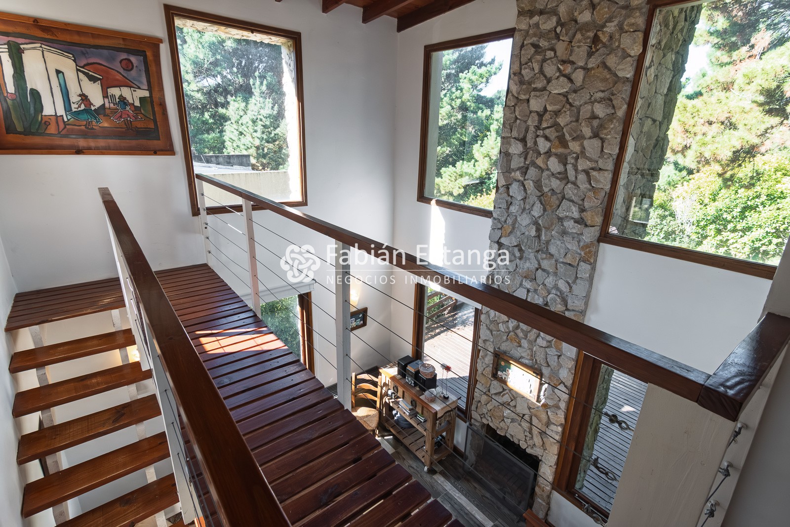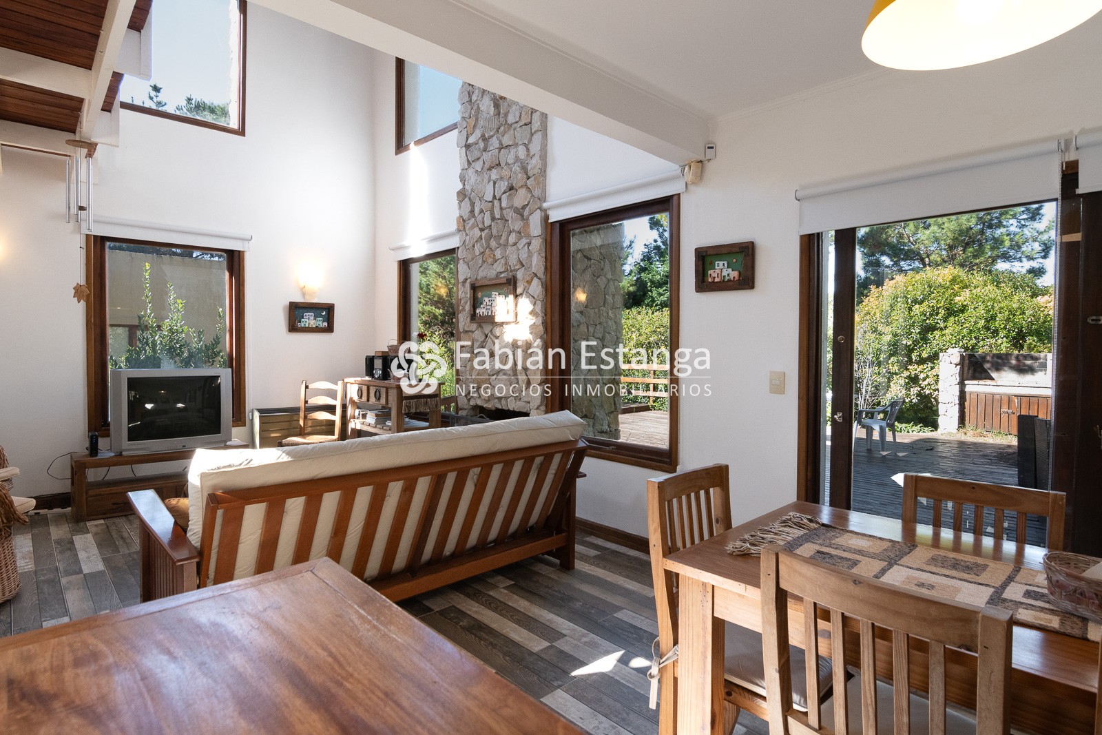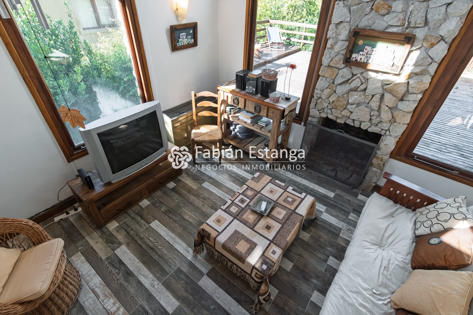 Amplio living comedor con hogar a leña, doble altura, amplios ventanales, calefactor tiro balanceado y salida a gran deck con increíble vista al fondo del terreno y parrilla.