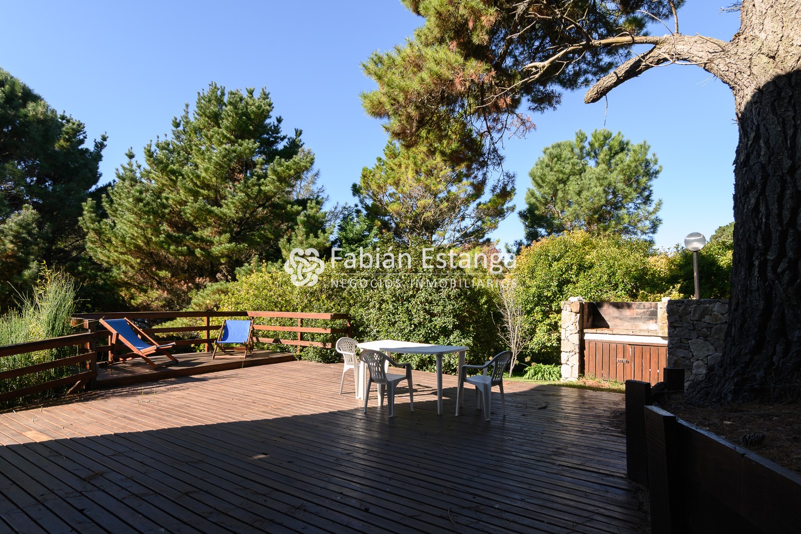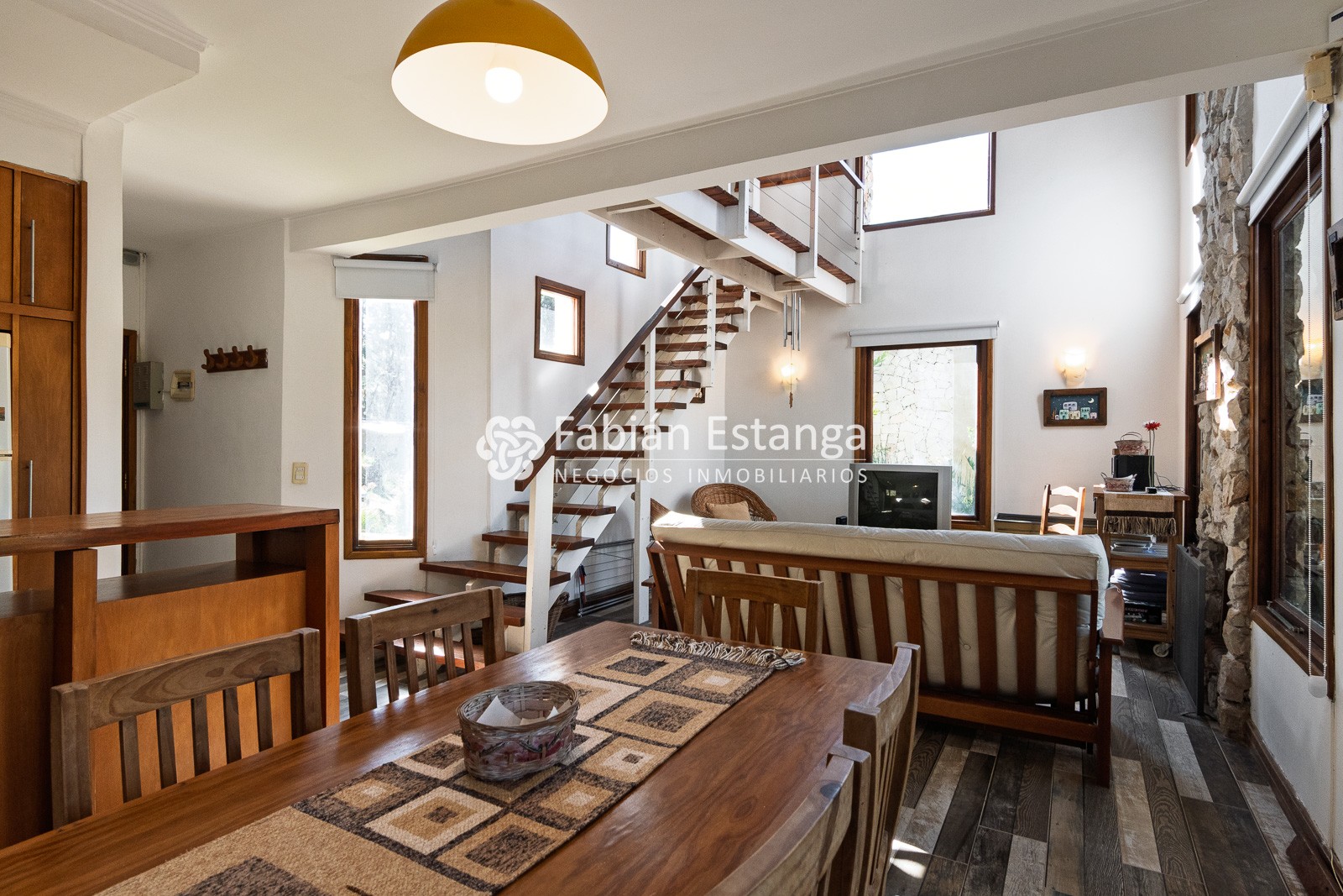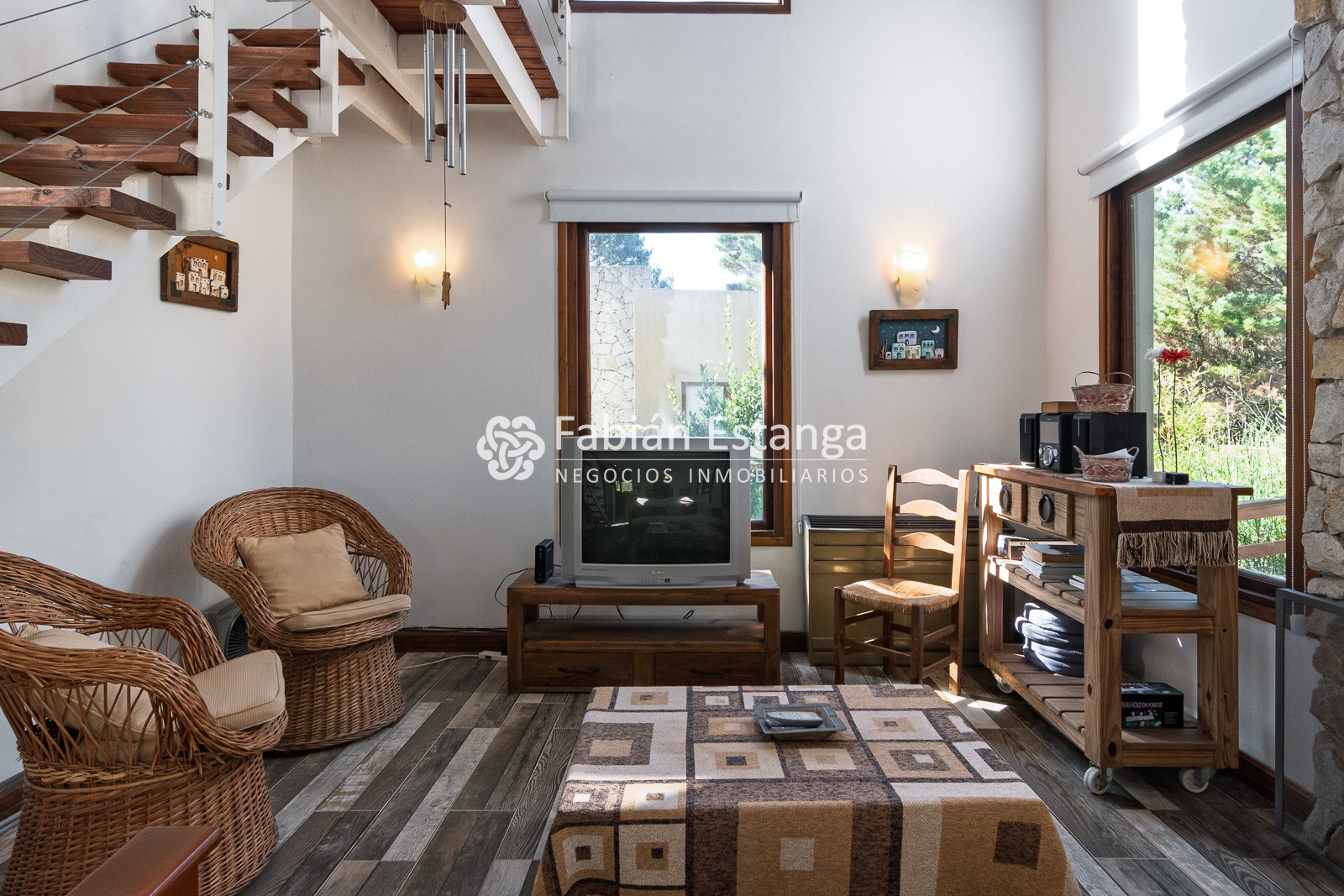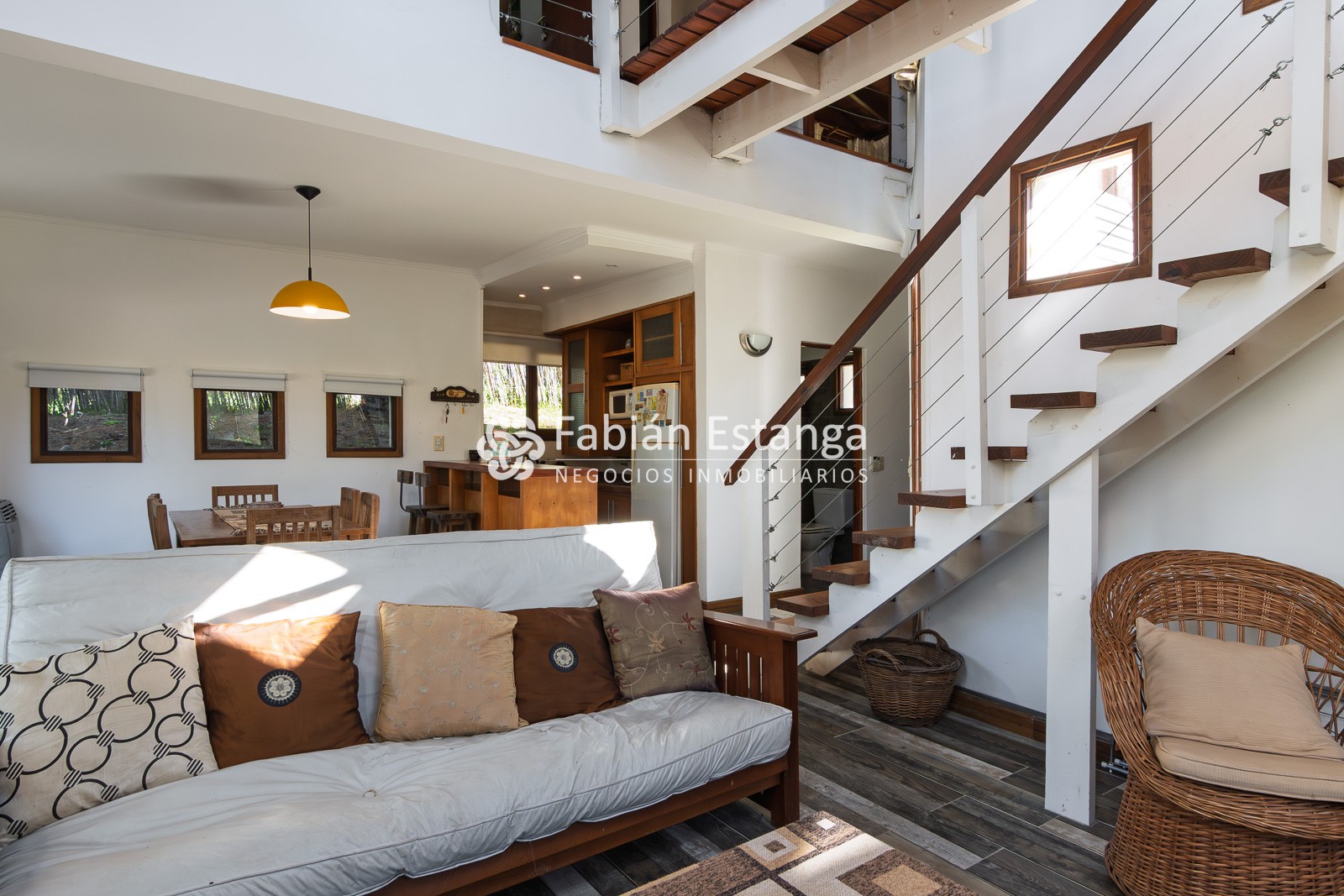 Amplio living comedor con hogar a leña, doble altura, amplios ventanales, calefactor tiro balanceado y salida a gran deck con increíble vista al fondo del terreno y parrilla.