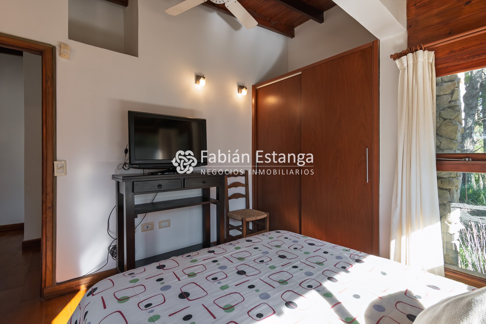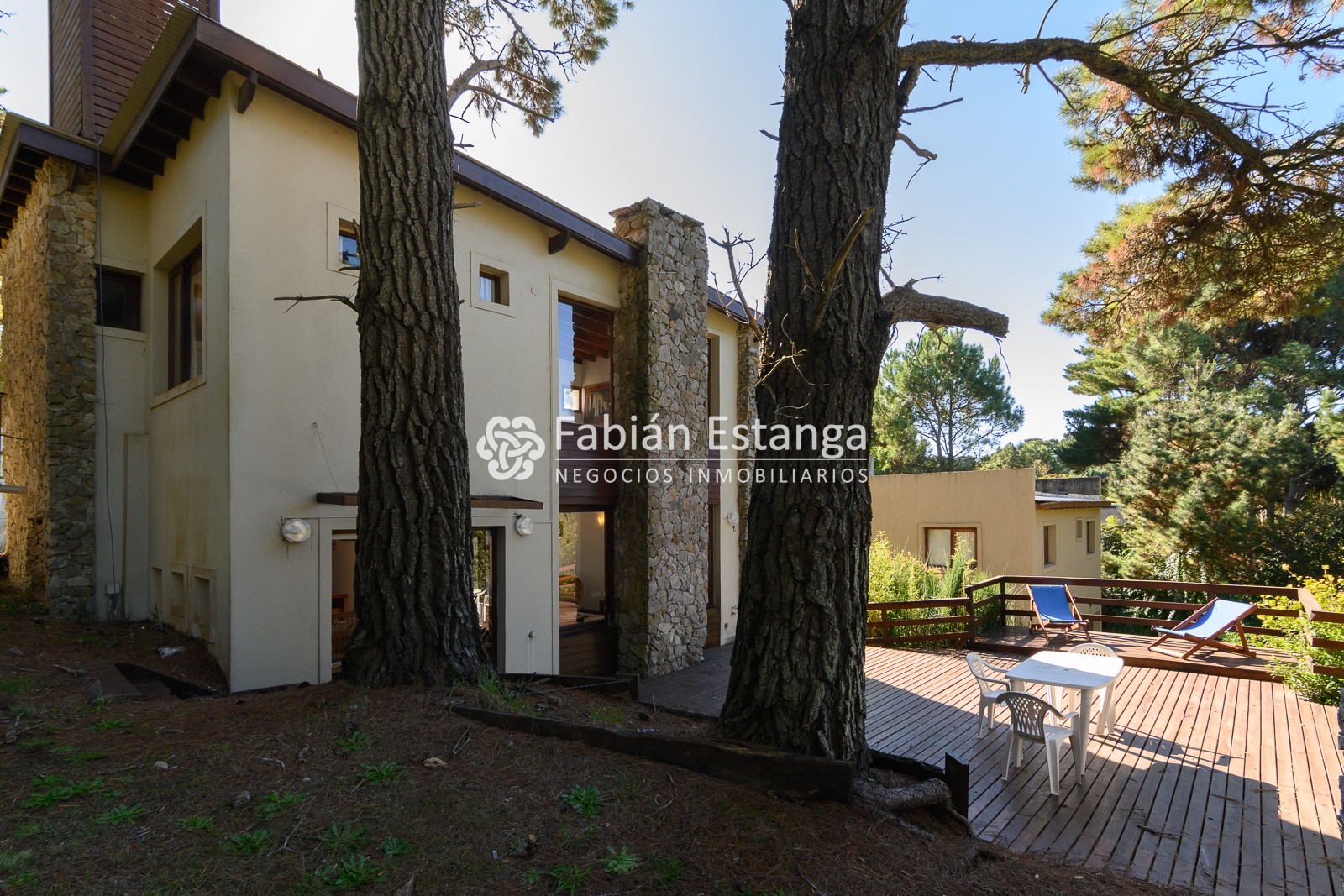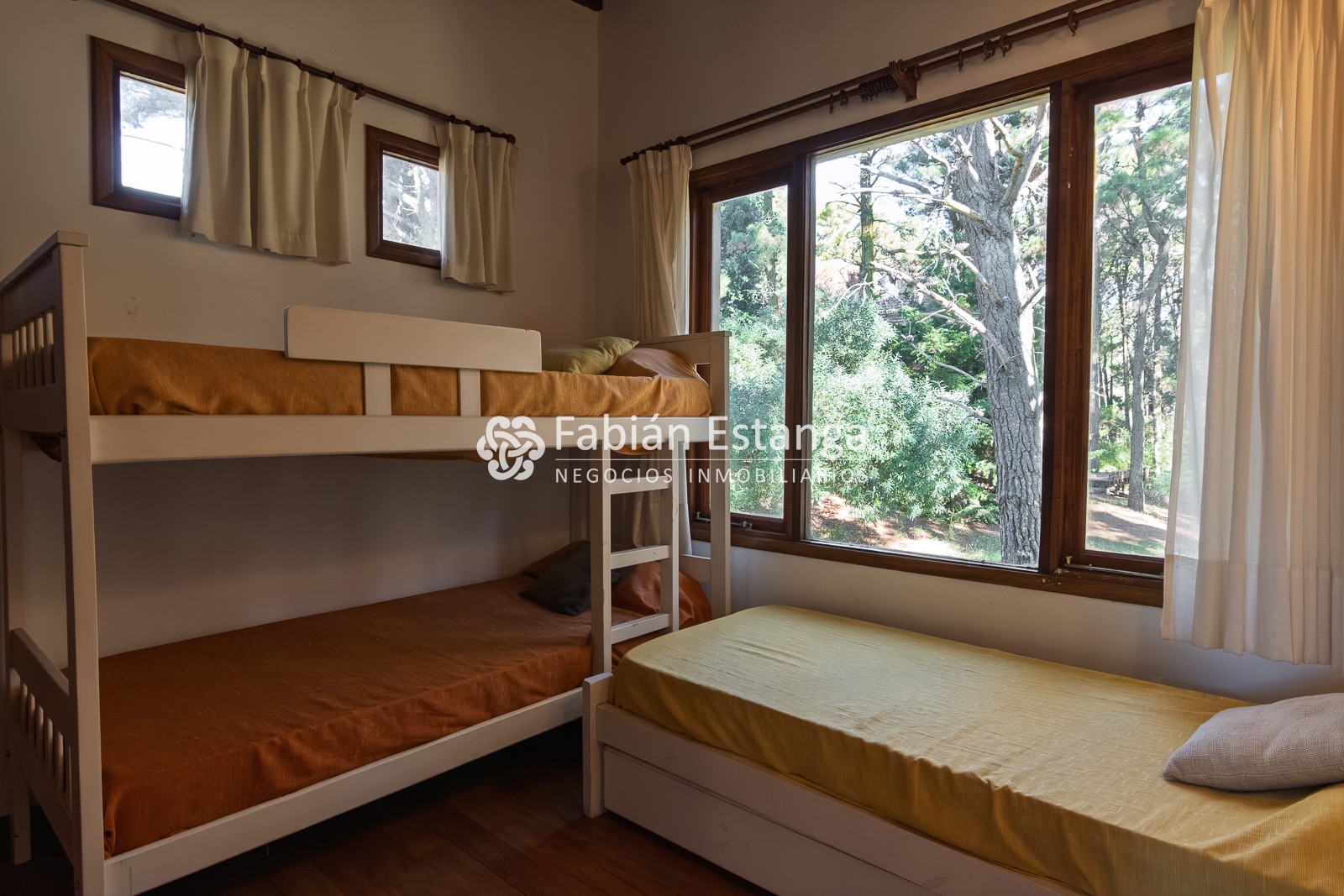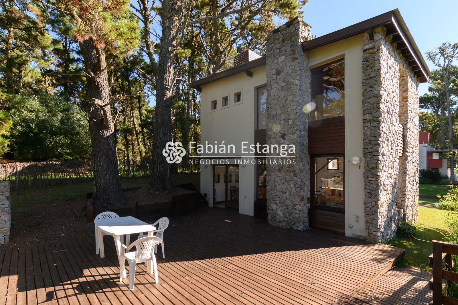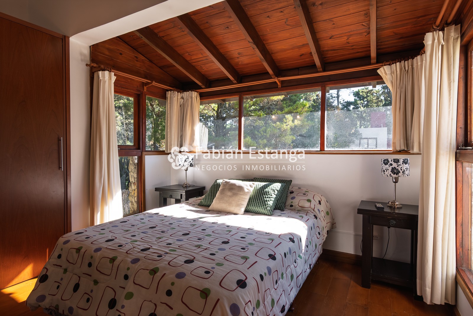 Amplio living comedor con hogar a leña, doble altura, amplios ventanales, calefactor tiro balanceado y salida a gran deck con increíble vista al fondo del terreno y parrilla.