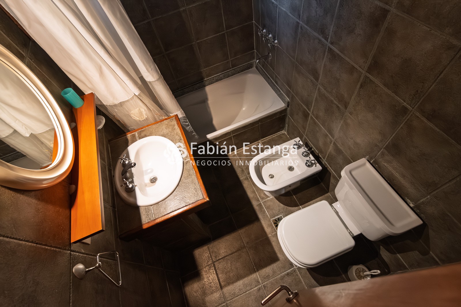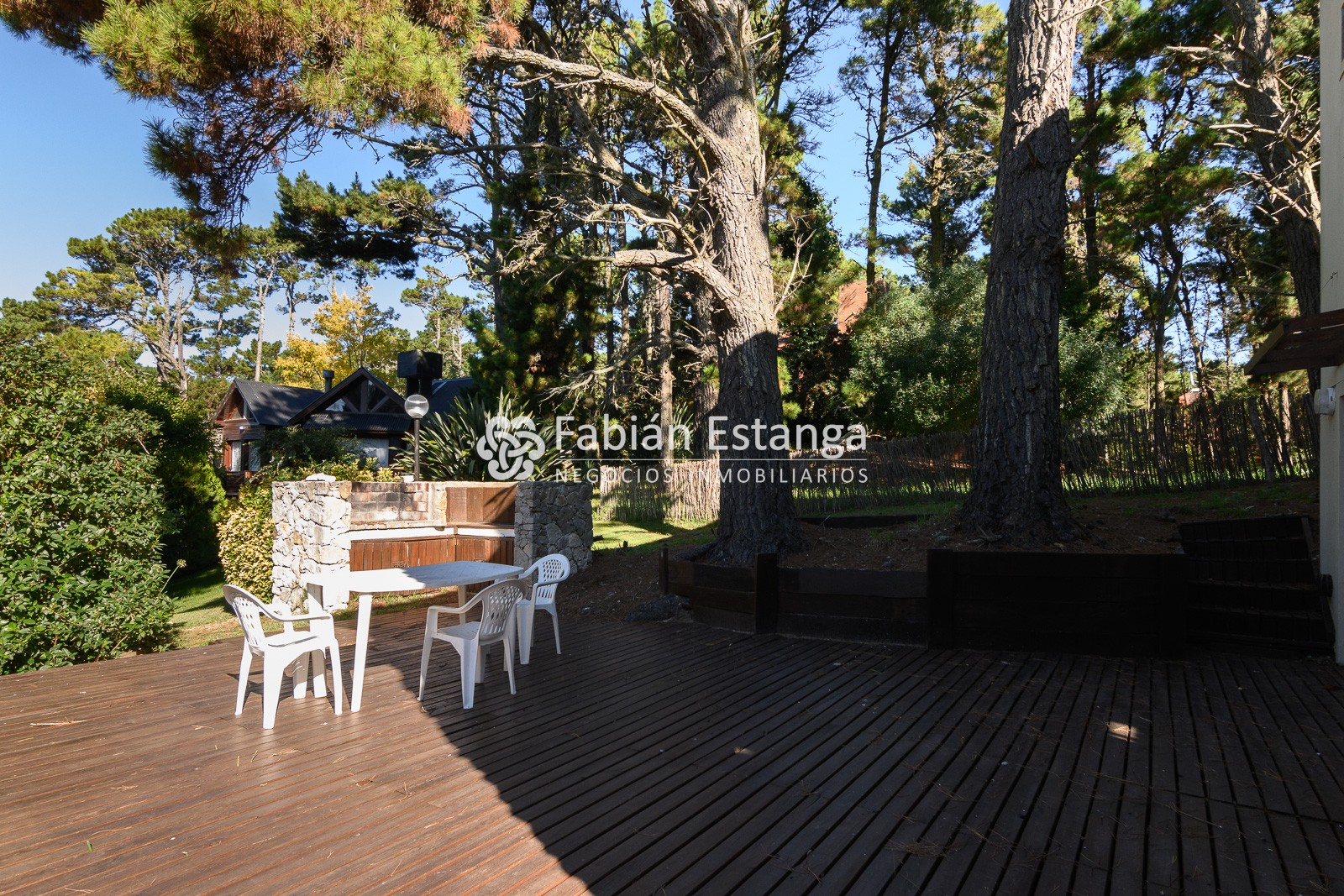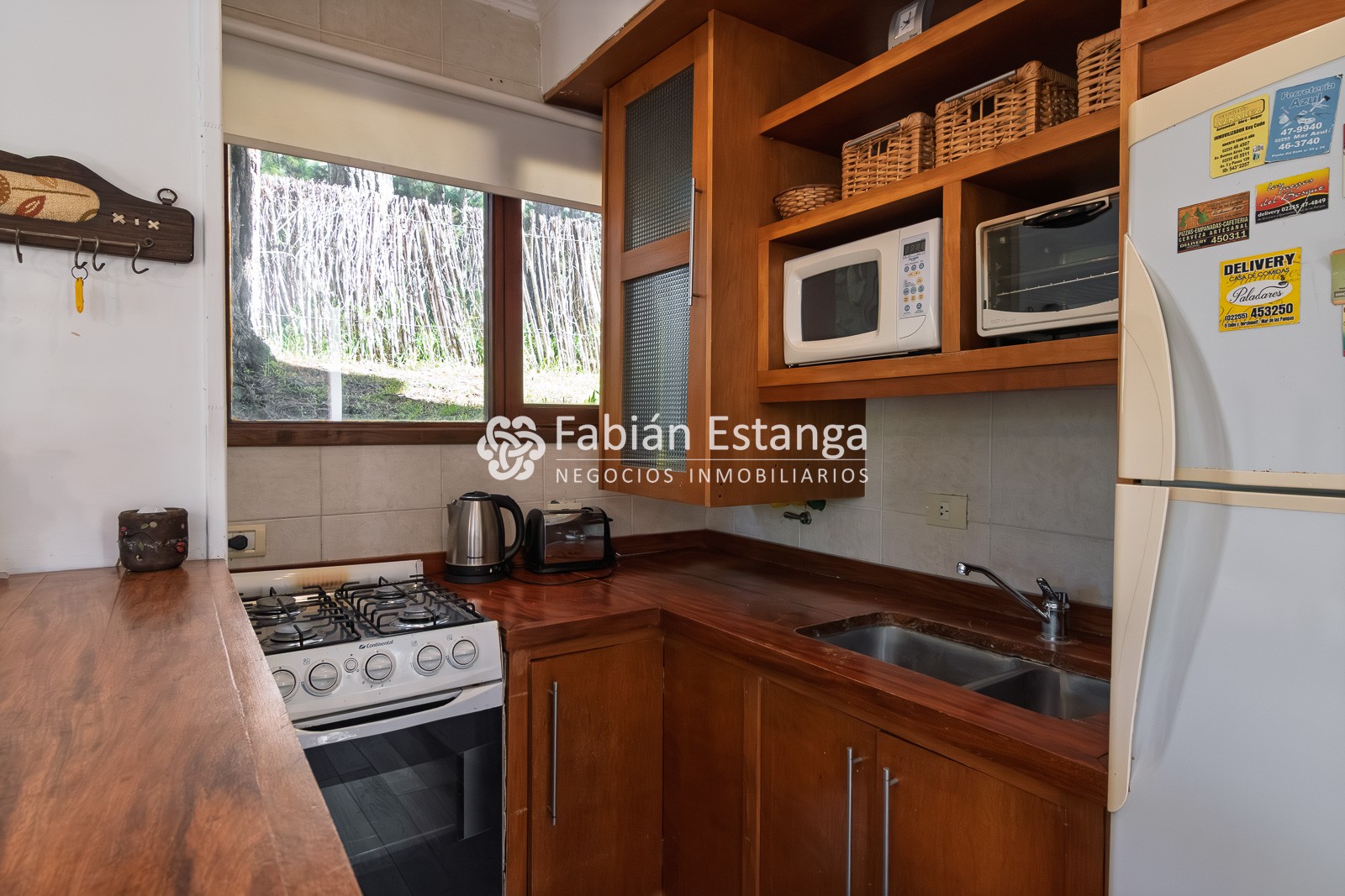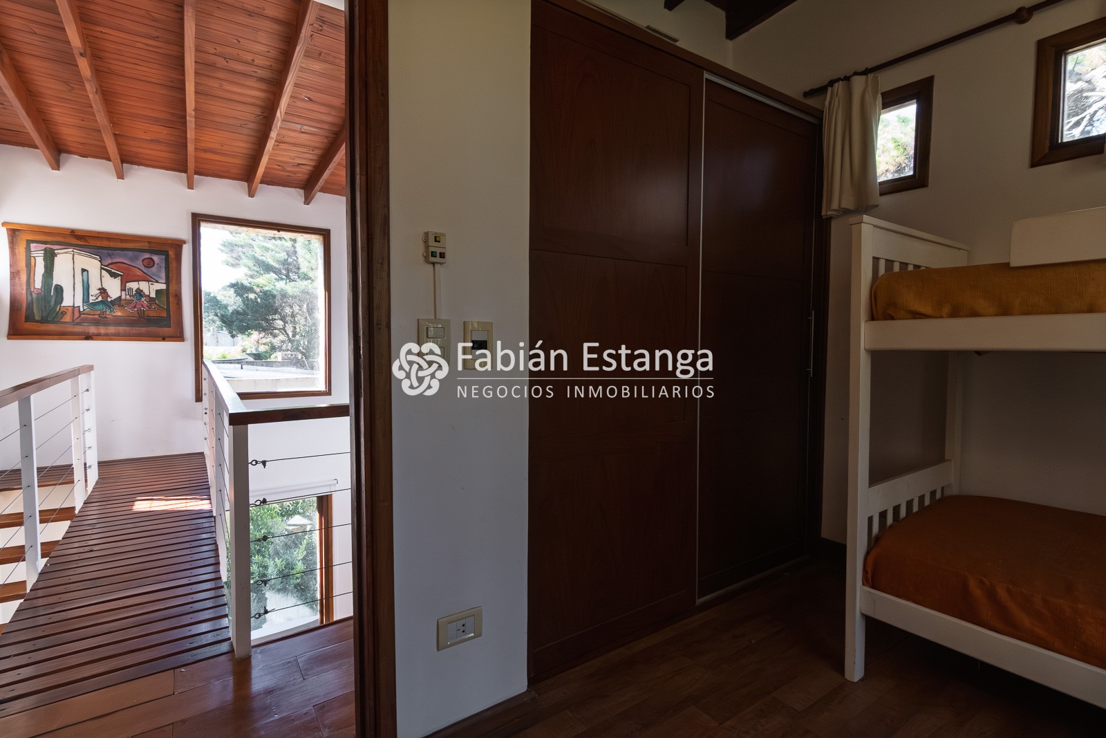 Amplio living comedor con hogar a leña, doble altura, amplios ventanales, calefactor tiro balanceado y salida a gran deck con increíble vista al fondo del terreno y parrilla.